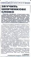 Лифар Г.В. Звучить Шевченкове слово, : [ засідання літературно-мистецької вітальні «Калинові дзвони» при Решетилівському терцентрі соціального обслуговування. «було влаштовано кн. виставку-вікторину «Кобзар у нашій оселі,»яку підготували працівники райбібліотеки/ Г.В. Лифар // Решетилівський вісник. – 2011.- 18 березня. – с. 8. |